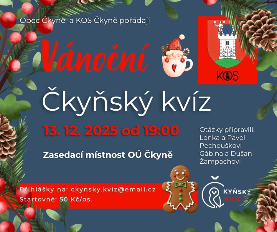 Obec Čkyně nás zve na vědomostní zábavnou soutěž pro 2-4 členné týmy dne 13.12.2025 od 19:00 v zasedací místnosti OÚ Čkyně. Přihlášky týmů na: ckynsky.kviz@email.cz.