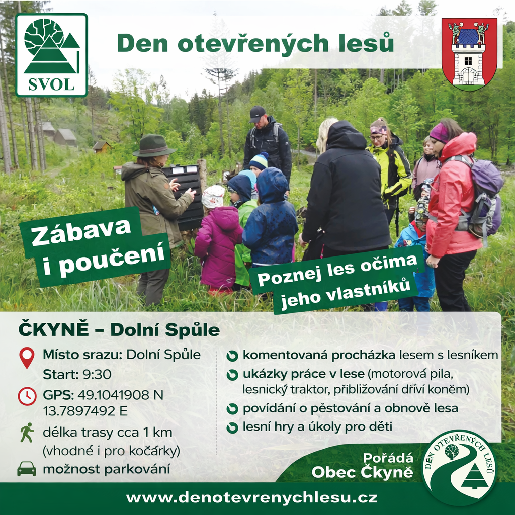 V sobotu 23.05.2026 od 09:30 pořádá obec Čkyně Den otevřených lesů pohledem vlastníka. Místo srazu je v Dolní Spůli. Všichni jsou zváni.