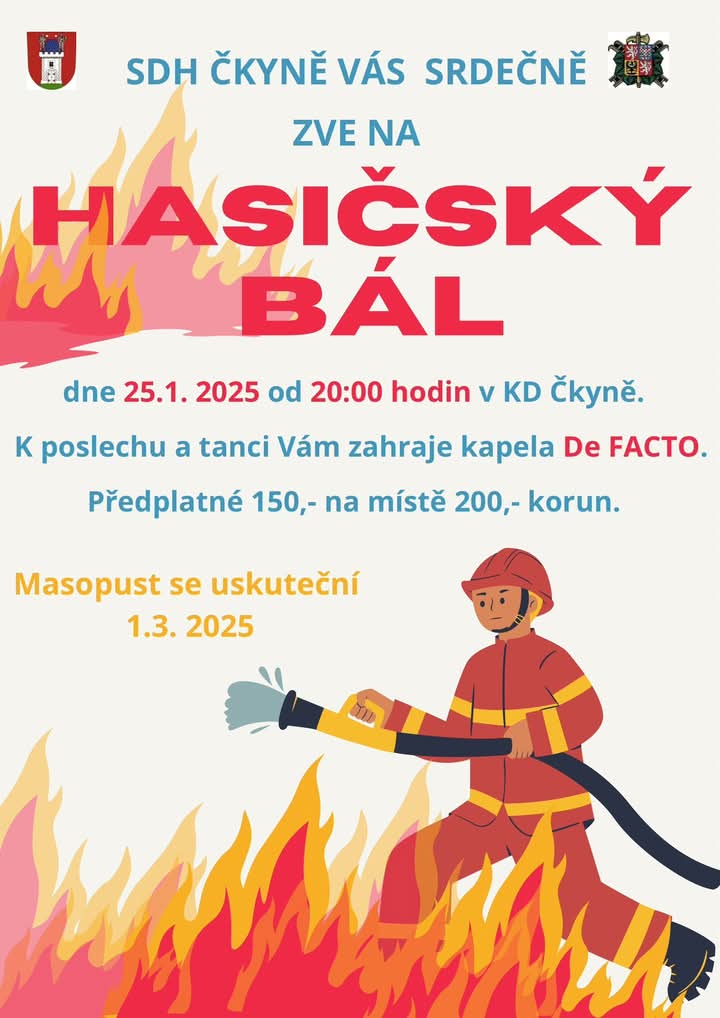 SDH Čkyně všechny zve na Hasičský bál dne 31.01.2025 od 20:00 v KD Čkyně.