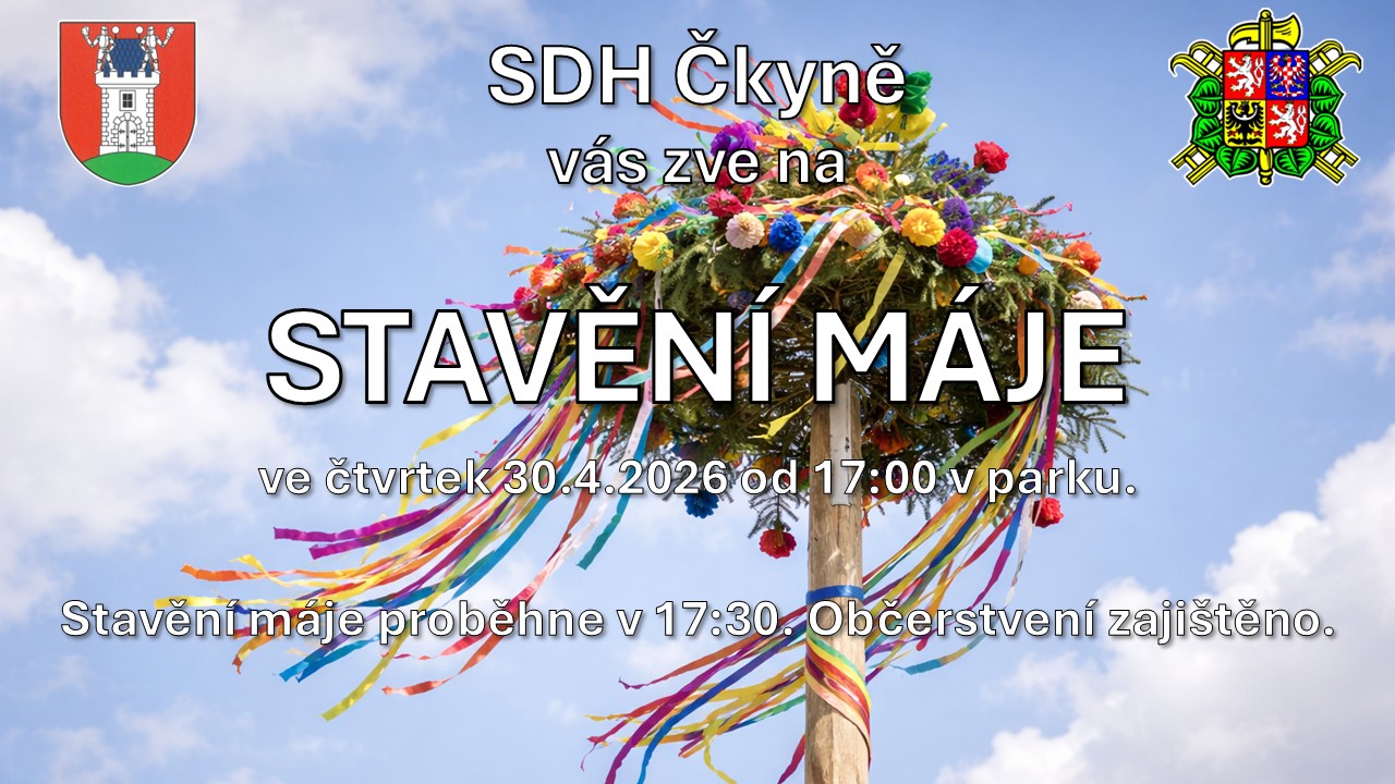 Stavění máje proběhne v parku ve Čkyni dne 30.04.2026 od 17:00 hodin v parku. Občerstvení zajišťuje SDH Čkyně.