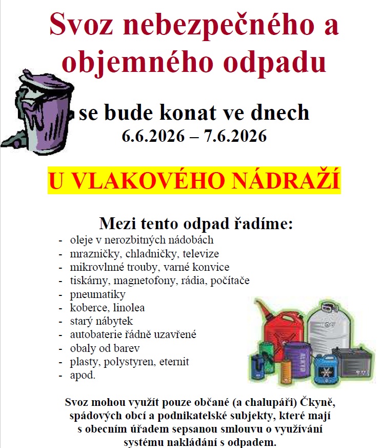 Obec Čkyně pořádá svoz nebezpečného odpadu ve dnech 06.06.2026 až 07.06.2026 v prostoru vlakového nádraží.